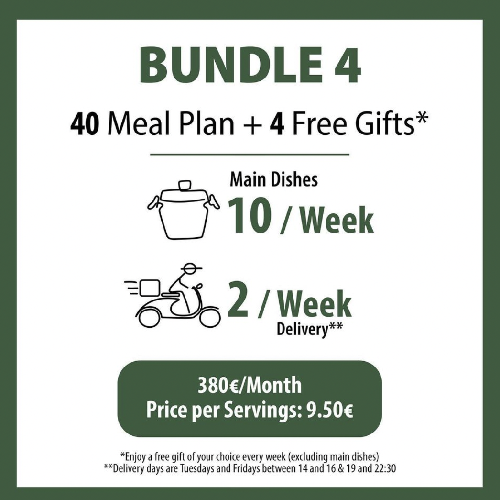 Please Make sure to create an account before trying to buy a bundle *Enjoy a free gift of your choice every week (excluding main dishes) Compare Our Plans EL MINI PLAN LA RUTINA EL DIARIO EL GRAN PLAN EL MINI PLAN Plan of 12 meals + 4 GiftsWeekly portion: 3 / WeekNumber of deliveries per week: 1 / WeekPrice: 150€ LA RUTINA Plan of 20 meals + 4 GiftsWeekly portion: 5 / WeekNumber of deliveries per week: 1 / WeekPrice: 220€ EL DIARIO Plan of 28 meals + 4 GiftsWeekly portion: 7 / WeekNumber of deliveries per week: 2 / WeekPrice: 295€ EL GRAN PLAN Plan of 40 meals + 4 GiftsWeekly portion: 10 / WeekNumber of deliveries per week: 2 / WeekPrice: 385€ Subscription details All plans are based on monthly subscription. Enjoy a free gift of your choice once a week (excluding main dishes) FAQs Can I choose any dish from the menu?– Yes, any main dish is available. BBQ grills are limited to one delivery at a time.Can I choose the delivery date and time?– Yes, during our store’s opening hours.Can I freeze my plan if I’m traveling or away?– Yes, you can pause your plan anytime.Can I get more deliveries than what’s included in my plan?– Yes, but extra deliveries will have an additional charge based on your location.Do I get a discount if I pick up the food?– Yes, you’ll get 10% off