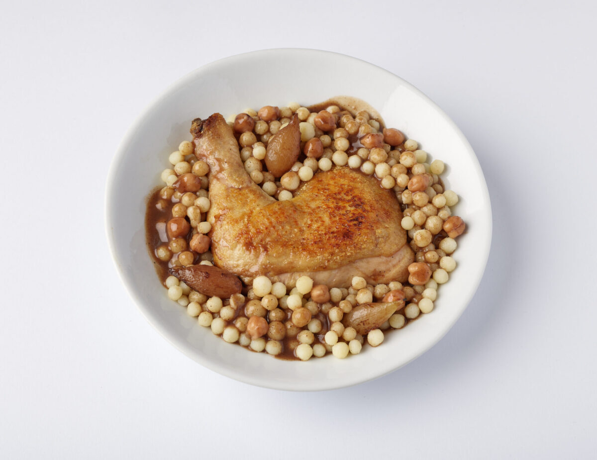Lebanese couscous cooked in chicken broth, topped with roasted chicken, chickpeas onions, and served in a special blend sauce